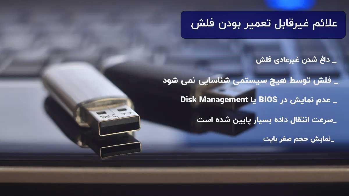 عدم نمایش در Disk Management یا BIOS: اگر فلش در ابزارهای سطح پایین هم شناسایی نشود، نشان دهنده مشکل سخت افزاری جدی است.